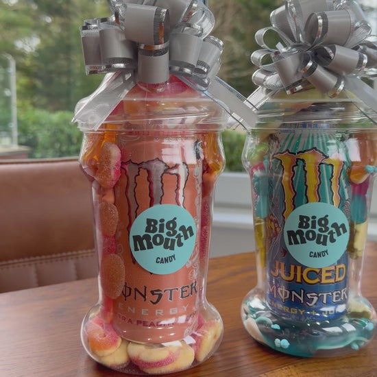 Unleash the ultimate sugar rush with our Big Mouth Candy Monster Jar! This eye catching gift features a Juiced Monster energy drink surrounded by a vibrant mix of 300g of premium pick n mix sweets from chewy sweets to fizzy favourites. Perfectly packed in a reusable jar topped with a luxury silver bow, it’s the perfect treat for Monster fans, birthdays, or sweet lovers.